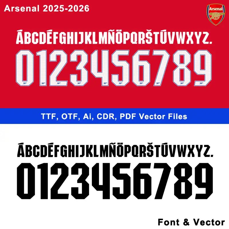 Elevate your design projects with the Arsenal 2025/2026 Font, a meticulously crafted typeface inspired by the legacy and spirit of Arsenal Football Club. Whether you’re creating fan merchandise, sports graphics, branding materials, or artistic works, this font package delivers versatility and a distinct Arsenal athletic aesthetic.